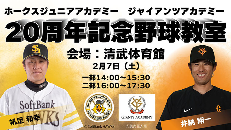 ホークスジュニアアカデミーおよびジャイアンツアカデミーの創設20周年を記念し、両球団が春季キャンプを実施する宮崎にて、2月7日(土)に野球教室を開催いたします。